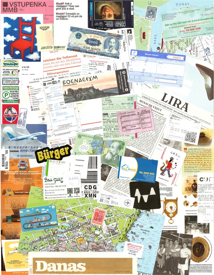En juillet 2023, je publiais un premier article sur mes collages réalisés à base de tickets, billets, cartes, journaux, etc., glanés lors de mes voyages. Les deux premiers collages couvraient neuf ans de périples à travers le monde (2014-2023), les trois qui suivent en couvrent dix (2014-2024). Je les ai réalisé il y a environ un an et demi, mais j’ai eu plus de mal à les faire reproduire que les deux premiers à cause de reliefs trop prononcés ! Tous les originaux font 65 x 50cm.