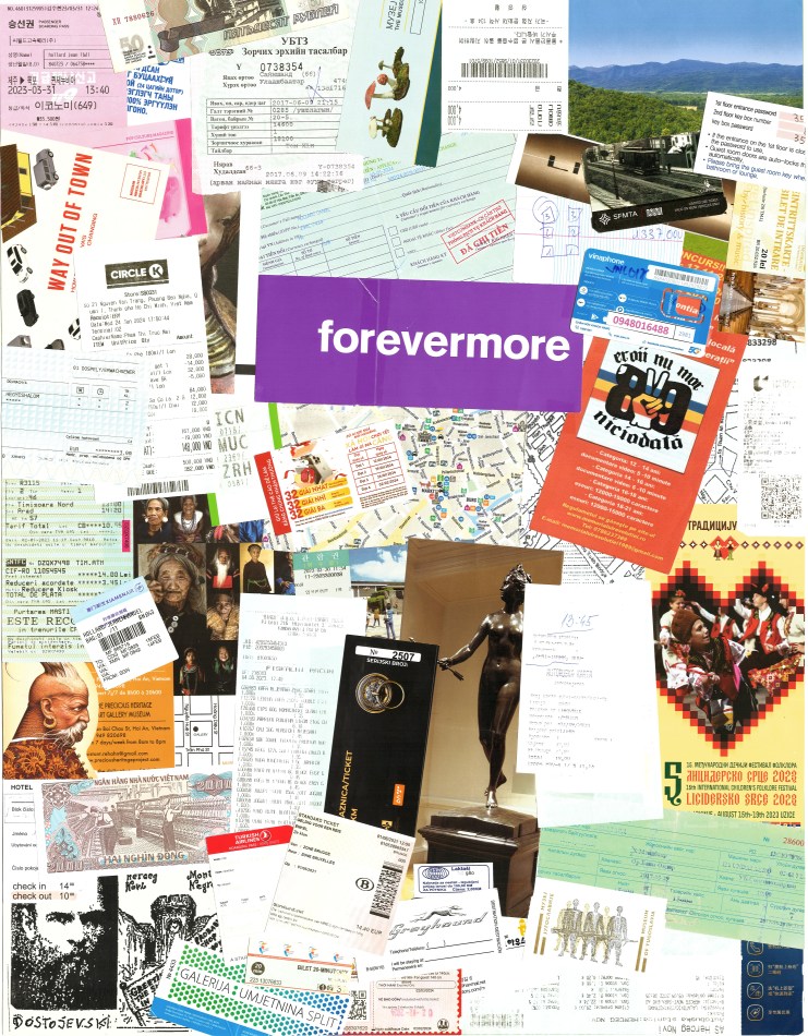 Contient (entre autres) : Le flyer d’un excellent festival de danses traditionnelles ; une carte postale du Monténégro avec Dostoïevski ; un billet de train de Mongolie ; le plan à la main d’un compartiment de wagon de train… Le gros forevermore du milieu vient du Musée des relations rompues, à Zagreb. Quand on l’ouvre, le message devient : nevermore.