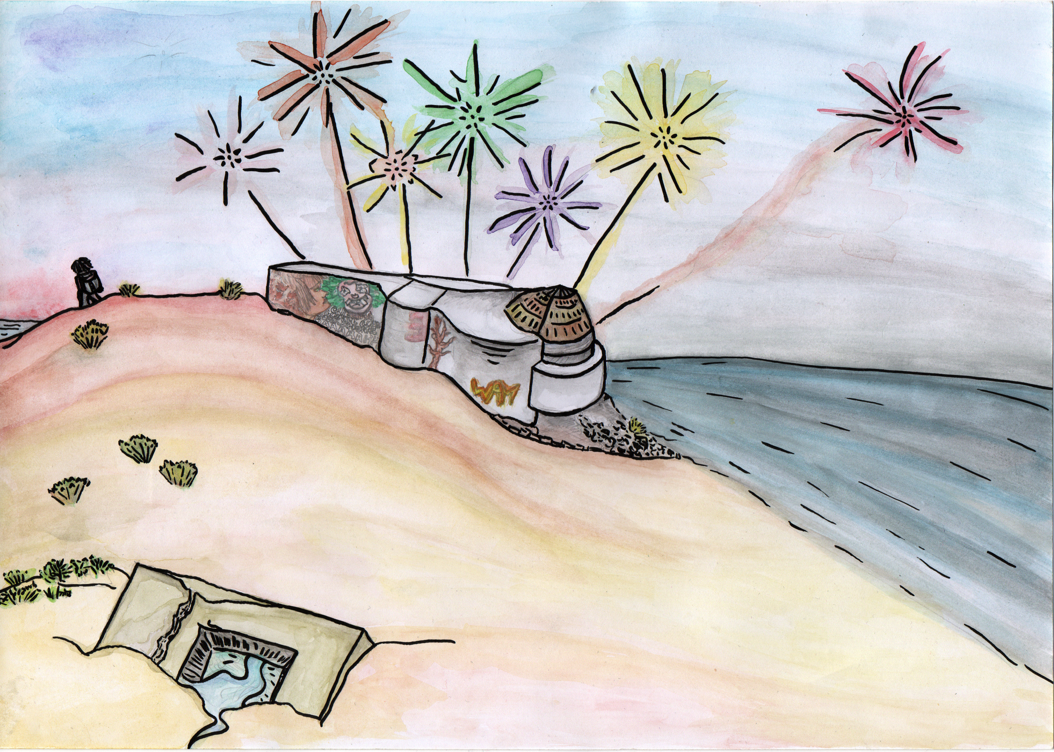 Antiblockhaus n’est pas un plaidoyer contre ces très romantiques ouvrages militaires qui m’ont servi d’abris, le préfixe anti signifie ici inverse, opposé, car cette composition se veut le contraire du blockhaus, cette carapace de béton armé, sombre et isolée, à l’épreuve des balles mais aussi de tout le reste, de la pluie, du vent, du soleil… Antiblockhaus propose d’aller sous l’averse et de laisser le bunker se faire lentement ensevelir par les sables, il est temps de vérifier si les explosions que l’on entend au loin sont des feux d’artifice ou des bombardements. Il faudra bien sortir un jour de toute façon, quel que soit le risque, non ?